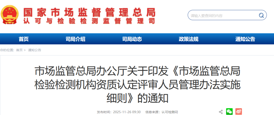 发表时间:2025-11-26 15:57来源:市场监管总局网址:https://www.samr.gov.cn/rkjcs/tzgg/art/2025/art_20617626f8d1484f889575f90e3e7834.html 为了加强市场监管总局检验检测机构资质认定评审人员管理,市场监管总局发布《市场监管总局检验检测机构资质认定评审人员管理办法实施细则》(以下简称《细则》)。《细则》对接受市场监管总局指派,承担资质认定技术评审工作的人员各项能力和要求作出规定。 ![]() 各省、自治区、直辖市和新疆生产建设兵团市场监管局(厅、委),中国质量检验检测科学研究院,各国家资质认定(计量认证)行业评审组: 现将《市场监管总局检验检测机构资质认定评审人员管理办法实施细则》印发给你们,请结合实际认真贯彻执行。 附件:1. 市场监管总局检验检测机构资质认定评审人员管理办法实施细则🔗