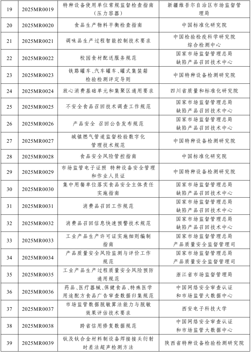 市场监管总局关于下达2025年度 市场监管行业标准制修订项目计划的通知 国市监办发〔2025〕106号 各有关单位: 按照《市场监管行业标准管理办法》和《市场监管行业标准制定管理实施细则》要求,市场监管总局确定了2025年度市场监管行业标准制修订项目计划(以下简称项目计划),现印发给你们,请认真组织落实。具体要求如下: 一、按期完成标准制修订任务。自项目计划下达之日起,制定项目应在24个月内完成(以报送报批稿时间为准)。 二、为标准制修订提供充分保障。项目负责单位尽快组织相关参与单位成立标准起草小组,研究制定标准起草工作方案,并在人员、经费、设备条件及相关资源利用等方面提供保障。 三、项目计划执行过程中有关问题,请与总局联系。 联系人:中国网络安全审查认证和市场监管大数据中心 于大东 010-88652562 闫小良 010-88652508 市场监管总局 2025年12月15日 ![]() ![]() ![]() ![]() |